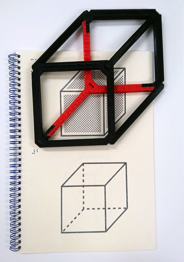 Hungry Fingers Cubograph, one of the most recent additions to the Hungry Fingers collection, is probably the first resource which attempts to explain to totally blind learners drawings of 3D geometric shapes. Edges of a collapsable cube can be compared with those in a tactile drawing, helping understand why some edges are drawn with solid lines and some with dashed lines. Understanding this serves as a basis for understanding drawings of other 3D geometric shapes in a book which comes with the Hungry Fingers Cubograph.
