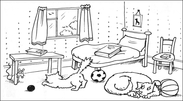 What is often overlooked is that with older children tactile graphics can be just as useful. Tactile graphics can give direct access to what is otherwise inaccessible. Such concepts of spatial relations as 'on the left', 'to the right' 'in front of', 'behind', 'under' and 'over' need not be visual when they are defined in relation to one's own body. They become visual though, when used with reference to other people and objects which are beyond one's reach. For explaining these visual concepts and spatial relations, graphic representation becomes indispensable, as this highly visual exercise in an English as a foreign language workbook will illustrate: