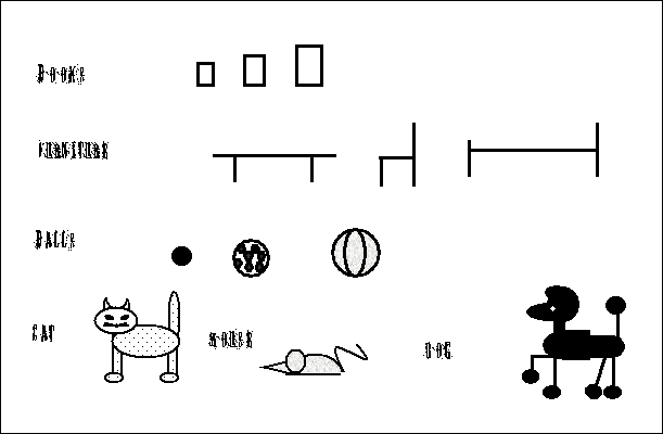 The object of the exercise is to identify spatial relations obtaining between objects and animals shown in the picture. It would be difficult to imagine how a totally blind person could make sense of the maze of lines, even if we were to make an exact tactile copy. And yet, a careful adaptation can make the exercise fully accessible to a child with no vision. Isolating the essential elements of the picture and introducing them to the young learner