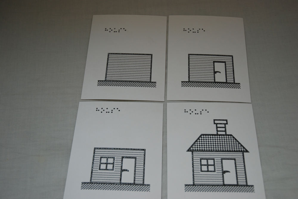 Sequence Cards: the next step (following Missor- Match). A collection of sets of tactile playing cards showing different stages of drawing familiar objects. The cards offer a range of possibilities to increase the child's confidence with tactile drawings through such activities as arranging the cards in the correct order, or playing a game where the players are expected to collect complete sets. With large print and Braille labels, the sets can be an effective tool for combining literacy with tactile graphics.