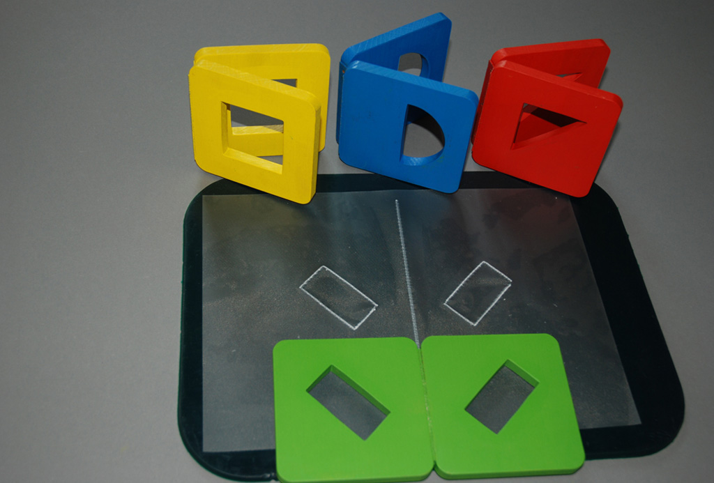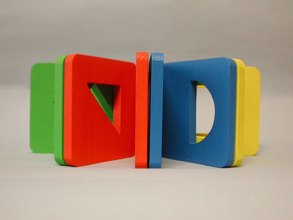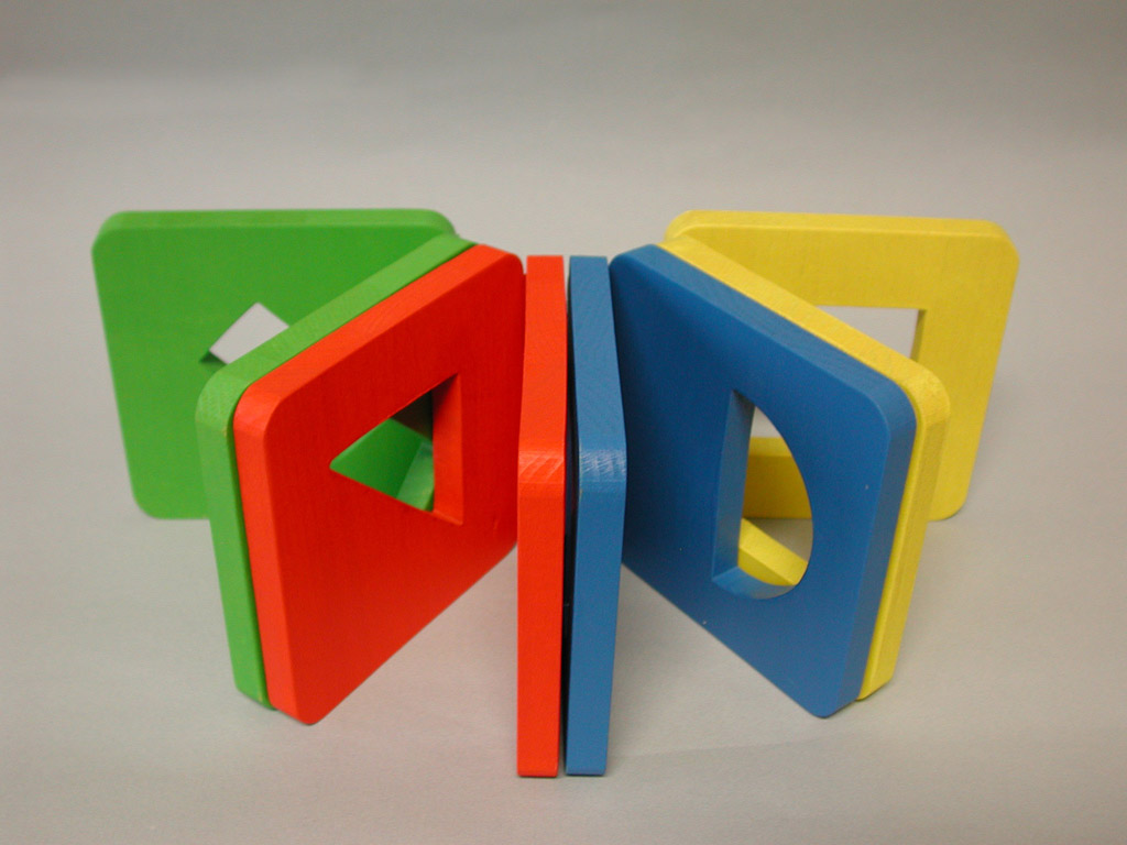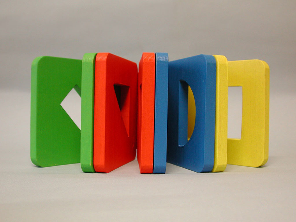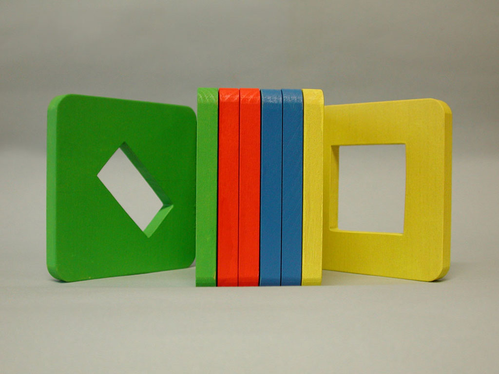 Hungry Fingers Symmetrograph – a set of four geometric shapes cut out in wooden plates which close and open like a book, helping the child understand the concept of symmetry. Used with embossing film, the plates work as templates for drawing symmetrical triangles, squares, rectangles or half-circles.
