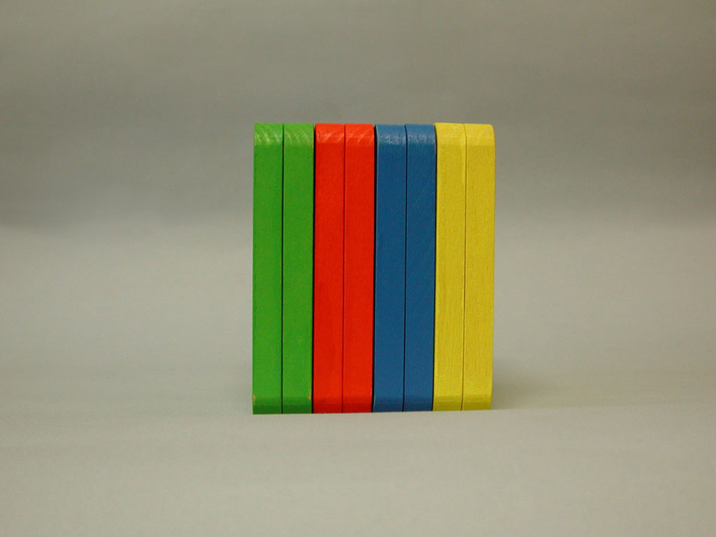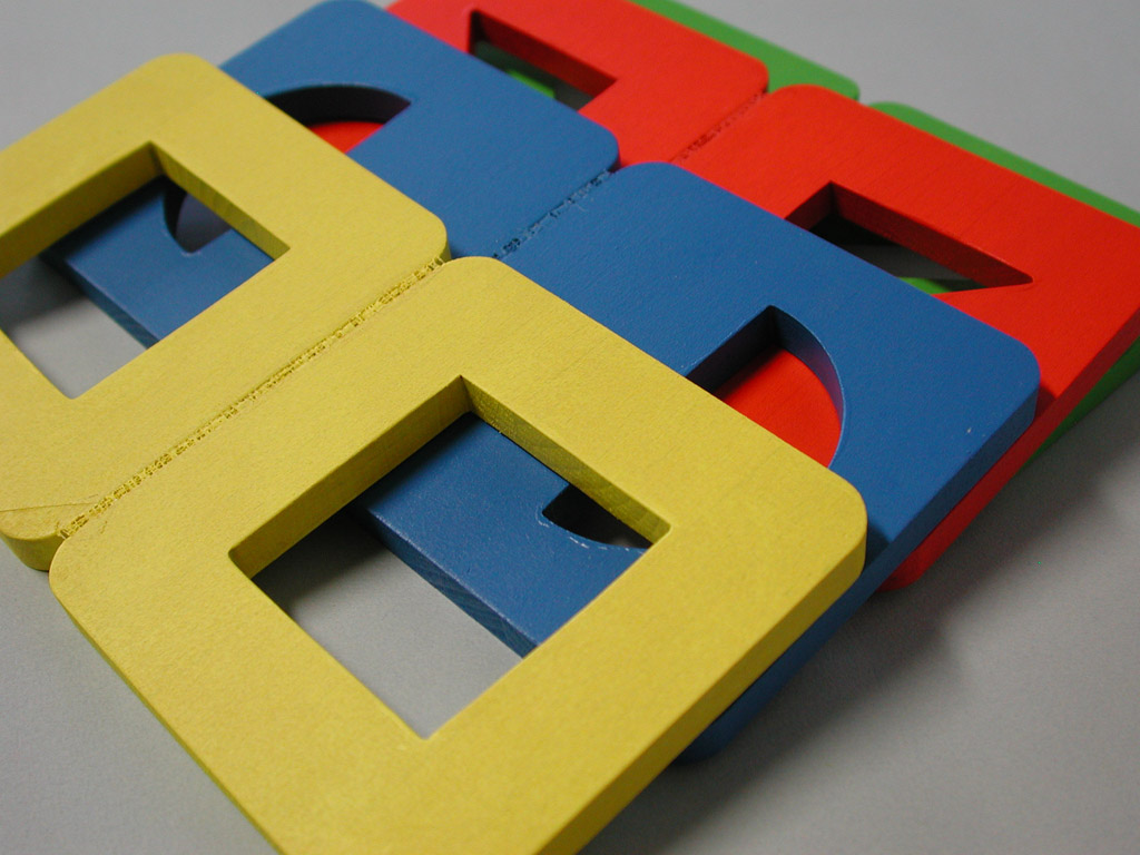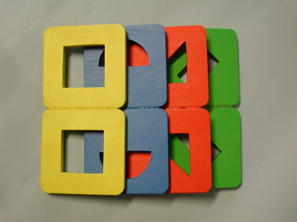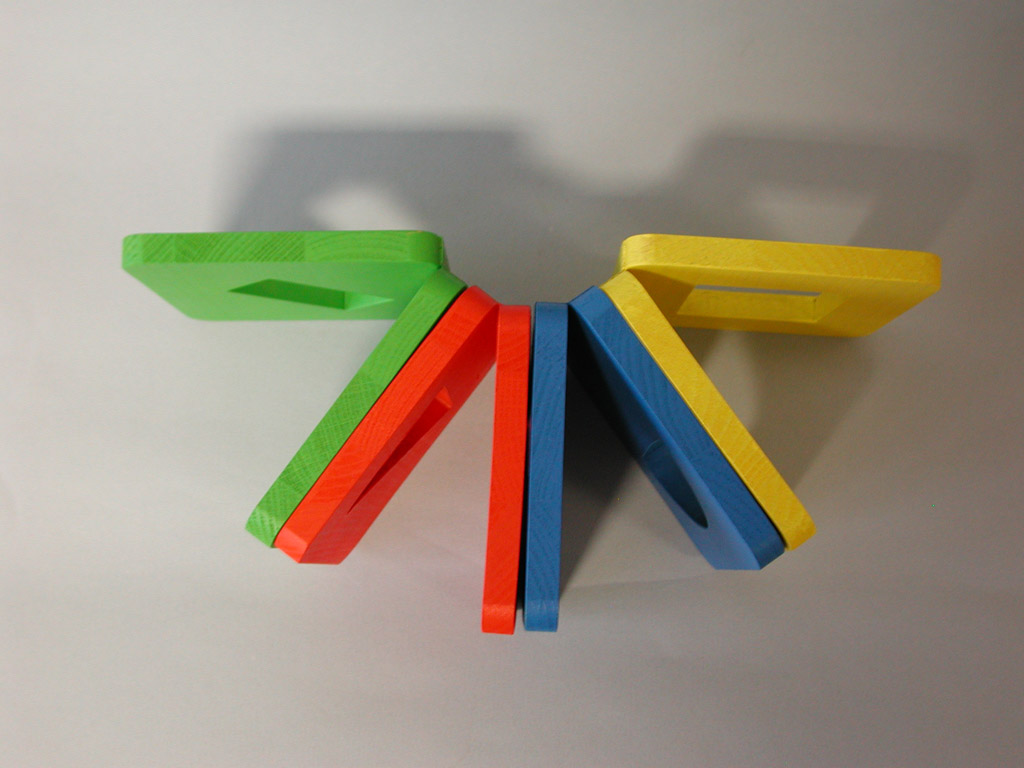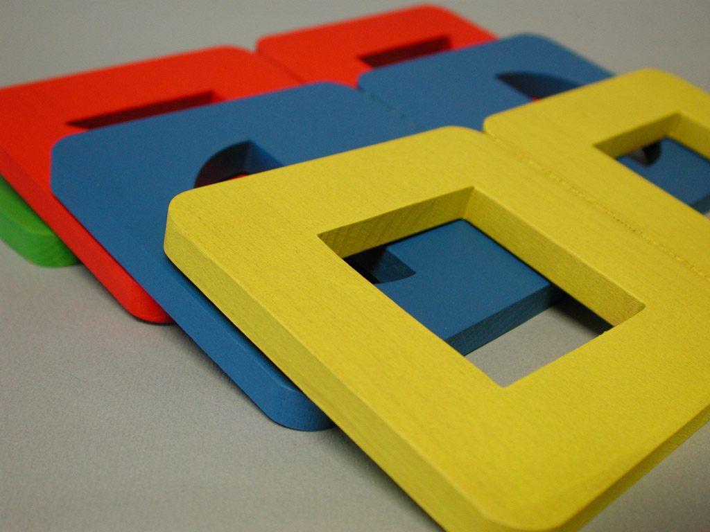 Hungry Fingers Symmetrograph – a set of four geometric shapes cut out in wooden plates which close and open like a book, helping the child understand the concept of symmetry. Used with embossing film, the plates work as templates for drawing symmetrical triangles, squares, rectangles or half-circles.